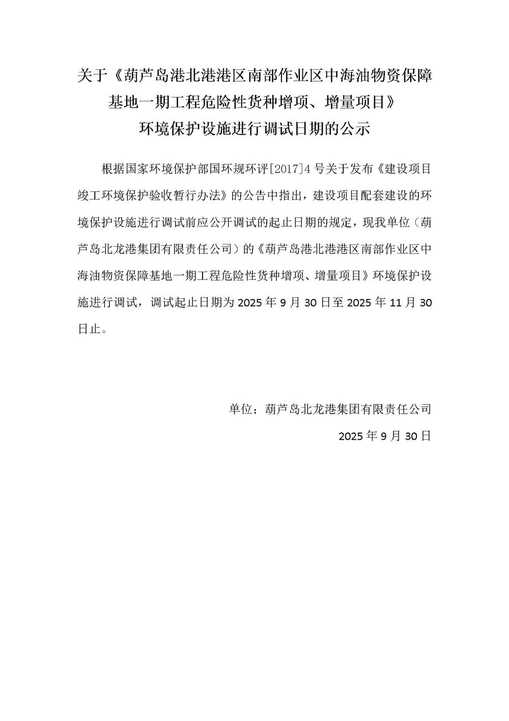 關于《葫蘆島港北港港區(qū)南部作業(yè)區(qū)中海油物資保障基地一期工程危險性貨種增項、增量項目》 環(huán)境保護設施進行調(diào)試日期的公示