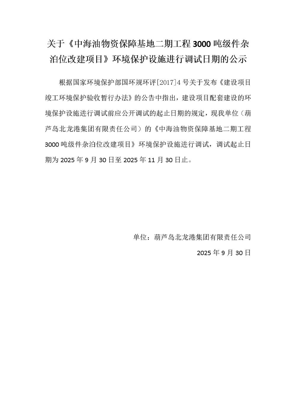 關(guān)于《中海油物資保障基地二期工程3000噸級(jí)件雜泊位改建項(xiàng)目》環(huán)境保護(hù)設(shè)施進(jìn)行調(diào)試日期的公示
